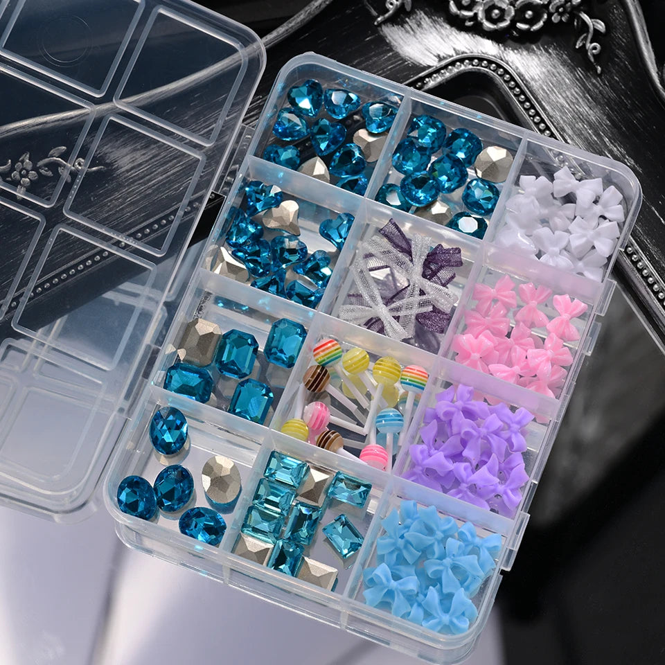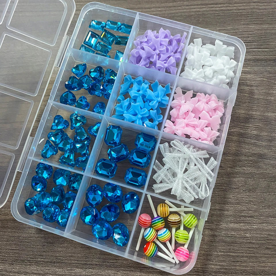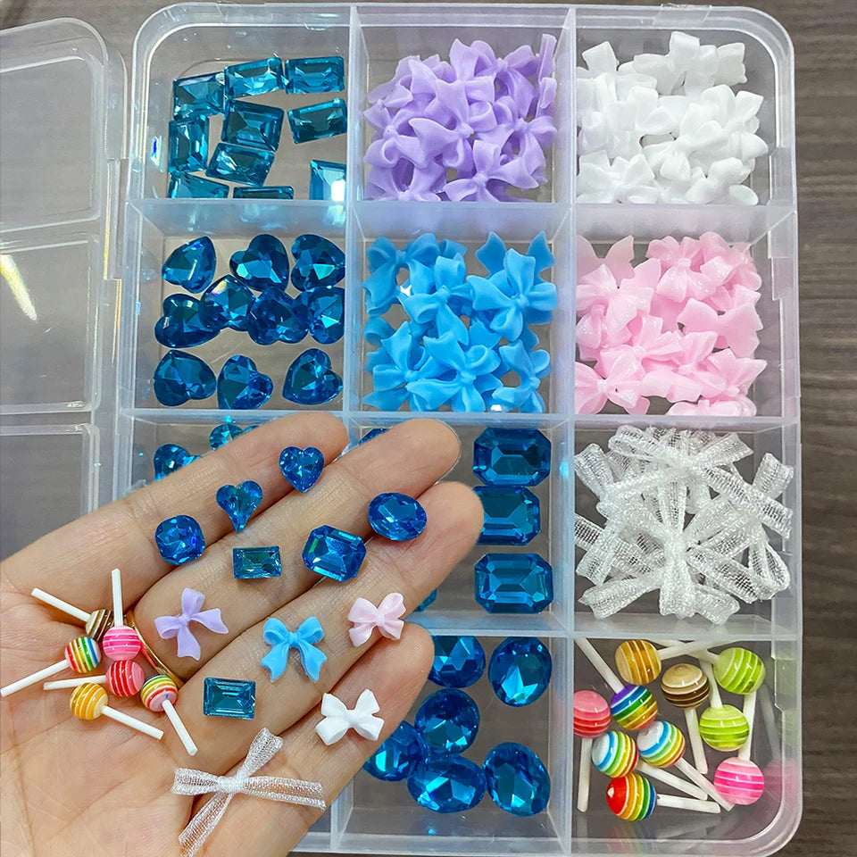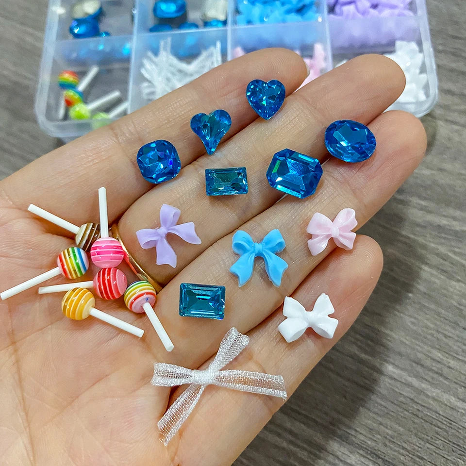 Les 12 motifs différents incluent des cœurs bleus, des arcs en résine rose et blanc, des nœuds en organza, et des sucettes. Créez des ongles uniques et adorables.