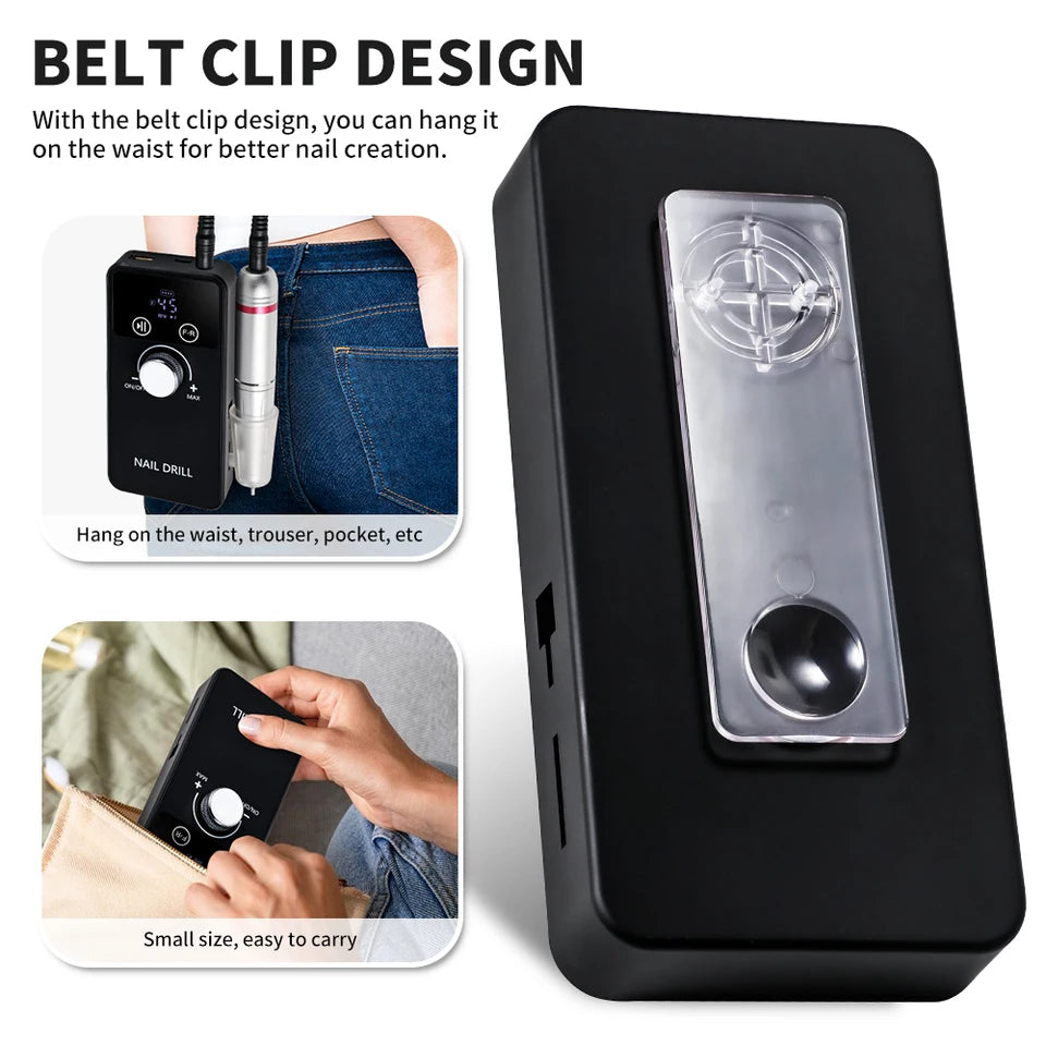 L'écran LCD intelligent de la PONCEUSES NAIL DRILL V5 ex affiche clairement la vitesse, la direction de rotation et la puissance restante, offrant un contrôle précis et facilitant l'ajustement des paramètres selon vos besoins.